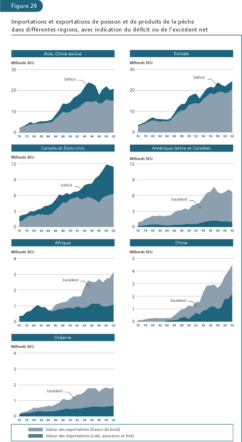 On ne dispose pas d’indications détaillées sur l’ensemble de la flotte mondiale de pêche après 1998, mais la taille de la flotte de certains des principaux pays qui pratiquent la pêche a continué à diminuer. Ainsi, la flotte de pêche de la Union européenne (UE-15) est passée de 96 000 navires en 2000 à 88 701 en 2003. Le chiffre total des navires se répartissait ainsi: 13 percent de chalutiers, 6 pour cent de senneurs, 33 pour cent de trémailleurs, 16 pour cent de palangriers – le reste étant composé de navires dotés d’autres engins de pêche. Sur les 87 833 navires de longueur connue, un peu plus de 80 pour cent mesuraient moins de 12 mètres et appartenaient en majorité à l’Espagne, à la Grèce et à l’Italie. Environ 15 pour cent des navires de pêche de la UE avaient entre 12 et 24 mètres de longueur, et moins de 340 navires avaient plus de 45 mètres de long (une soixantaine d’unités de moins que cinq années auparavant). En décembre 2002, la Norvège avait une flotte de pêche inscrite au registre de 7 802 navires pontés à moteur et de 2 847 navires non pontés. Les statistiques comparatives indiquent que la flotte de navires pontés a encore perdu 628 unités (8 pour cent) depuis 2000, et que le nombre d’embarcations non pontées a encore diminué de près de 40 pour cent. À la fin de 2003, l’Islande comptait 1 872 navires inscrits sur un registre, dont 50 pour cent non pontés, soit 63 unités de moins qu’en 2002 et une baisse de l’ordre de 7 300 tonneaux bruts pour la jauge de l’ensemble de ces différentes catégories de navires. Près de 40 pour cent des chalutiers (environ 75 pour cent de tous les navires pontés) ont plus de 10 ans. En Nouvelle-Zélande, dont la zone économique exclusive est l’une des plus étendues du monde, il y avait en 2001 1 700 navires néo-zélandais de pêche à vocation commerciale, complétés par 36 navires étrangers affrétés; ces chiffres représentent 1 102 navires néo-zélandais et 43 navires affrétés de moins qu’en 1992.