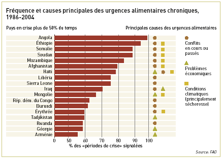 Très souvent, les facteurs d'origine humaine et naturelle se renforcent les uns les autres, engendrant les crises les plus graves et les plus longues. Entre 1986 et 2004, 18 pays étaient «en crise» plus de la moitié du temps et, dans tous les cas, la guerre ou les bouleversements économiques et sociaux avaient soit provoqué soit aggravé la situation (voir graphique ci-contre). On le voit par cet exemple, les crises prolongées et fréquentes entraînent dans leur sillage une sous-alimentation répandue et chronique. D'après les dernières estimations de la FAO, 13 de ces 18 pays comptent parmi ceux où plus de 35 pour cent de la population ne mange pas à sa faim.