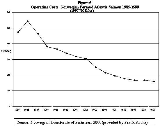 Figure 4 clearly shows how consistent the growth of Norway's farmed Atlantic salmon has been, the result of relatively controlled production and market management. The degree of control is further indicated by the consistent decline in cost of production, as seen in Figure 5.
