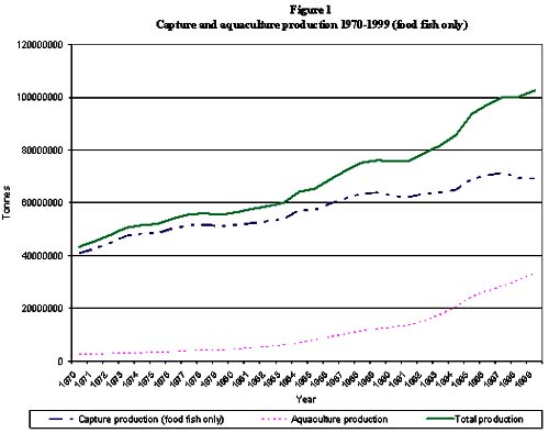 Before moving forward with my perspective, it is advisable to consider the relative importance of aquaculture in the harvest of fish and aquatic products. On a global scale, aquaculture accounts for approximately 26 percent of all fish harvests; however, as seen in Figure 1, aquaculture represents 33 percent of all "food fish" (excluding Clupeiformes) harvest (FAO, 2001)[3]. In either case, most of the growth in global fish supply is derived from aquaculture. The importance of aquaculture becomes more apparent when we consider some specific examples: