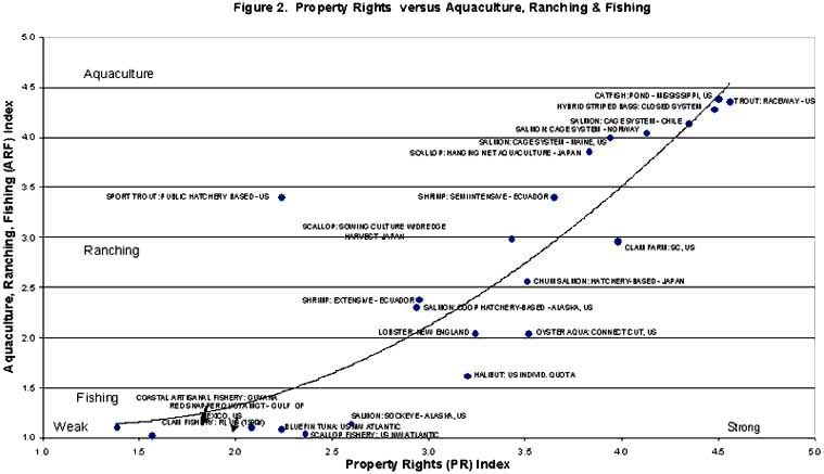 Traditional fishing exists under weak property rights, and intensive aquaculture exists under strong property rights.