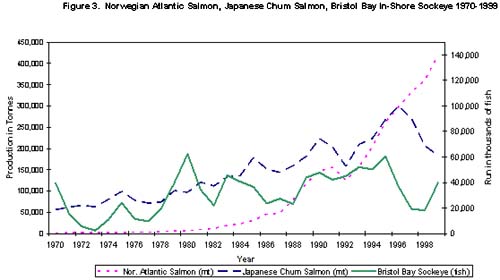 These gains were the result of investment in technology, breeding programs, nutritional improvement, better farm management, and disease control. Both survival and growth rates improved (Asche, 1997). Note the clear difference in volatility in the Bristol Bay sockeye fishery and the Japanese hatchery-based chum salmon fishery. Although pen-raised salmon now dominates the market, while inefficiently managed salmon fisheries struggle, the farmed salmon sector's production could still increase considerably.