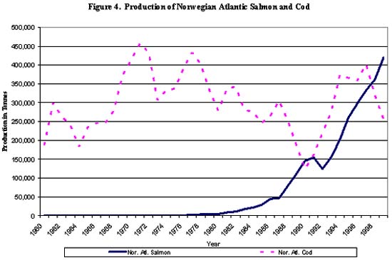 In Norway, both the landed value and quantity of farmed Atlantic salmon exceeds its traditional Atlantic cod harvest (FAO, 2001).