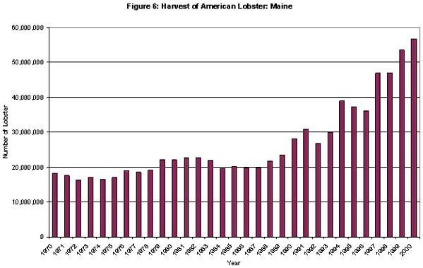 The Maine lobster harvest broke an all-time record in 2000. In addition, the fishery has shown remarkably low volatility year-to-year relative to other fisheries (Figure 6), despite expectations by fisheries experts for over two decades that the fishery was headed for imminent decline (Anthony and Caddy, 1980 or Status of Fishery Resources of the Northeast United States, any issue after 1985). According to Steneck and Auster (2001), it is the "only species in the world that has been targeted more than 15 years and is more abundant today than ever in the past." The reasons why this has occurred are still unclear. Habitat has been identified as an important limiting factor, as have the size of the spawning population and other environmental factors (Wahle and Steneck, 1992; Caddy, 1986).