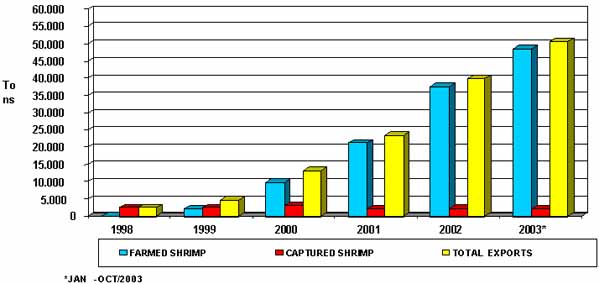Projections for the farmed shrimp sector in 2003 show expressive numbers in terms of exports, 62 000 tonnes and US$220 million. For 2005, the projected numbers for total production and export earnings are, respectively, 160 000 tonnes and US$500 million.