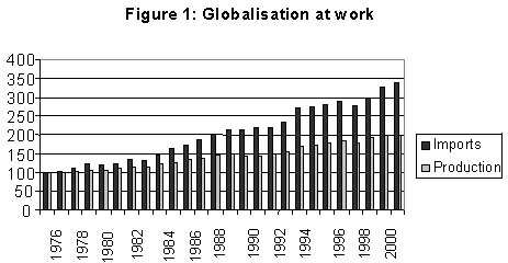 One way of capturing the globalization process has been captured in Table 1 giving an index of respectively world production and world imports (both based on quantities). What is evident form the graphic representation is that trade has increased more rapidly than production thus suggesting that markets have become more intertwined.