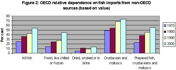 The following Figure 2 highlights the dependence of OECD countries on imports from the non-OECD (mostly developing) countries. The very high dependence on imports of crustaceans and molluscs is caused by shrimps and prawns and this group, because of its relative high unit values, has pushed up the overall dependence.