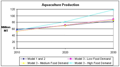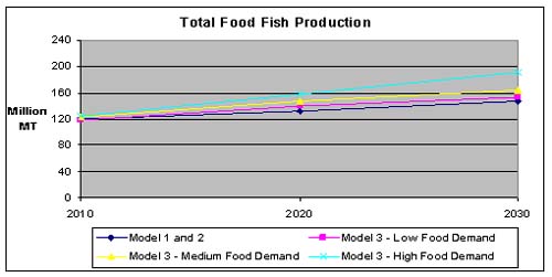 Total supply is estimated to reach almost 160 million tonnes by the year 2030. In fact, scenario one and two forecast an annual aquaculture production raise of two percent, reaching about 84 million tonnes by 2030, while it arrives at more than 87 million tonnes in the medium food demand scenario of Chan.