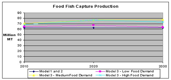 Developing countries will confirm their role as main consumers, but their importance as producers will grow - especially concerning aquaculture production. The increasing demand will have impact on per caput consumption and trade patterns. Various scenarios exist in FAO to project future demand and supply of fish and fishery products[26]. With regard to supply, the three scenarios agree on the fact that the world food fish capture production has basically reached its limit at about 70 million tonnes and any production increase will be primarily due to aquaculture.