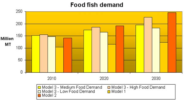 Scenario 2 on the other hand considers a constantly growing per caput consumption which leads to a substantial increase in demand. In this case, total demand would more than double from present level to almost 250 million tonnes, well ahead of potential production. Given the prevailing trade patterns (South-North) it would result in a strong increase in prices, both in developed and developing countries, resulting in a lower demand. International trade would suffer, as more fish can find a market in the domestic market of developing countries with strong interest in fish consumption, such as China and South East Asia.
