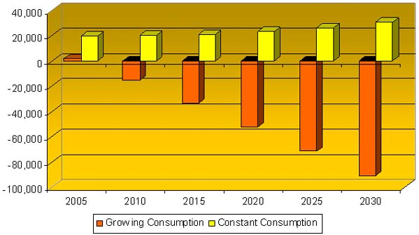 Argentina's presumed strong increase in demand for fishery products from currently 8.6 kg per caput to 14.7 kg in 2030 leads to a different scenario. Capture production almost certainly remains stable at 1.1 million tonnes and the growth in aquaculture is unable to keep the pace of demand. The surplus production of fishery products will decline by almost 50 percent from presently 0.6 million tonnes to 0.34 million tonnes in 2030.
