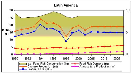 In Latin America the per caput consumption of fish products has been relatively stable during the past years. Considering an average per caput consumption of 8.7 kg in the future, the region as a whole will produce an annual surplus of 15 million tonnes of fishery products (including fishmeal). In the projection, capture production is supposed to stabilize at 19.1 million tonnes, while aquaculture grows at a rate of 1.8 percent per year.