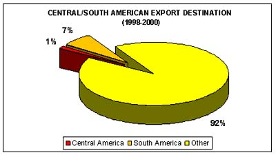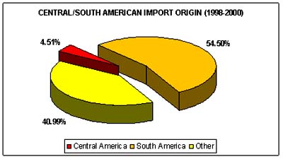 Intra-regional trade has a major impact on fishery commodity imports in the region of Central/South America. In the period between 1995 and 1997, about 60 percent of the imported value originated from countries belonging to the region of Central and South America. This share remained basically stable in 1998-2000.