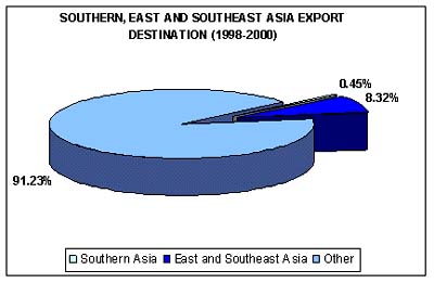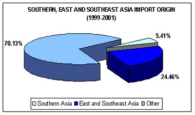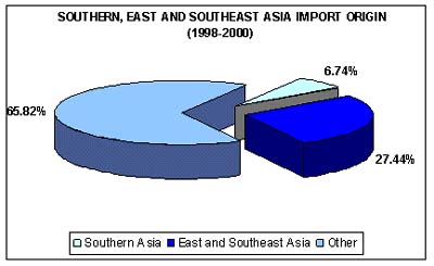 Intra-regional trade accounts also for an important part of fishery commodity trade in the South/East area of Asia. In value, about a quarter of all fishery product imports in the region is coming from East and Southeast Asia (US$755 217 000 in 1998/2000, US$819 796 000 in 1999/2001).