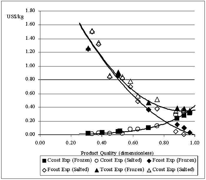 Resultant values from the application of the model along with value from fish processing plants are presented. The quality costs for frozen blocks of hake fillets (Merluccius hubbsi), salted anchovy (Engraulis anchoita) and results obtained at Cuban plants for frozen lobster (Panulirus argus) were analyzed. The resultant correlation for the data obtained from real plants and from the model is shown in Figure 2. The following are the regression coefficients for curve fits in Figure 2.