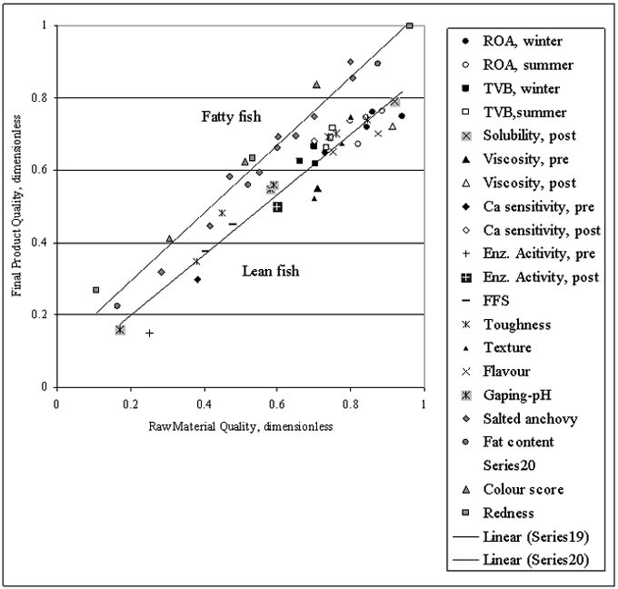Results from a comparative study of quality relationships observed in products made of lean or fatty species showed that a greater influence of raw material quality on labour productivity and yield is observed when fatty fish is compared with lean species. It was also found that as raw material quality level rises, these variables increase as well as operating costs decrease (Giannini et al., 2001; Zugarramurdi et al., 2002; 2003). The results indicated that the quality of raw material has a direct correspondence to the quality of the product. A linear correlation between raw material and final product quality was found, with a lower slope in the case of white fish, when compared in dimensionless scale with pelagic species like anchovy, as shown in Figure 1.