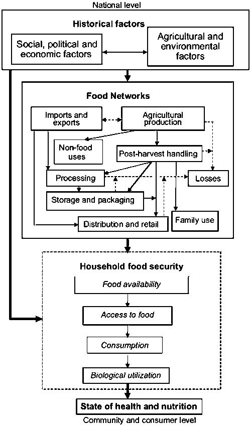 Figure 3 shows one example of the effort to model a historical analysis of the global factors governing food security which produce a given state of food and nutrition. This is a simple, general model of sequential relations. Obviously, there are a great many possibilities and proposals for models representing factors, relationships and causalities with reference to food security. The example presented here is cited solely to illustrate the type of analysis which is possible, and the type of model which can be constructed.
