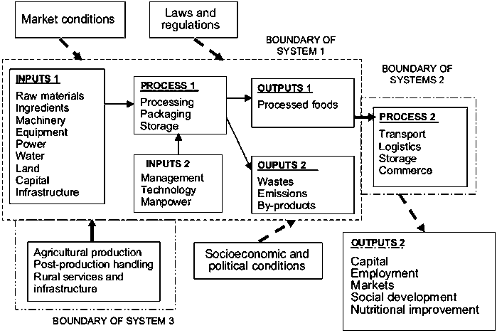 Looking at the above analytical concepts for the agrofood sector or system from the systems standpoint, we can see that the social purpose of the system is food security, whereas normally the global economic purpose is wealth creation and profit. We may look at the various participating actors and their technical, social and economic relationships and interdependencies in the various geographical areas within a given country or group of countries. Analysis may focus on a sector, a sub sector, or various interlinked sectors, at the micro or macro level, or combinations of both. We need to identify and characterize relationships and hierarchies. In this approach, the boundaries of the system are defined by a given set of food sectors or products and by groups of actors, including enterprises, as well as those enterprises supplying goods, services and capital inputs. We also need to consider how institutions, socioeconomic, and political forces interact, in addition to the environmental characteristics that serve as a backdrop to the system. Its nucleus must include the pre- and post-production chains (and their ramifications) within which the agroindustries operate. Presented below are examples of the various analytical degrees and horizons of agricultural systems, from the national macroeconomic setting, to the microeconomic community environment, to the internal environment of a food processing enterprise. The emphasis is on the food chain and on processing,