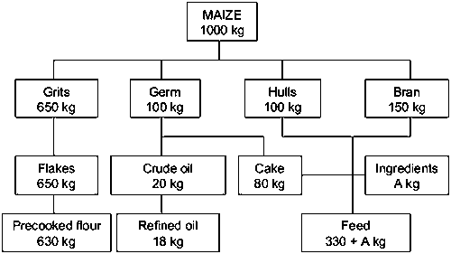 Cuevas et al. (1985) also present an additional way of analyzing systems relationships in a subsystem like that of an industrial maize processing plant, using a materials balance diagram, as shown in Figure 7 (which does not explicitly show all losses). Similar diagrams can be prepared for energy balance and cost analyses, all based on primary specialized information obtained directly from the detailed study of manufacturing processes.