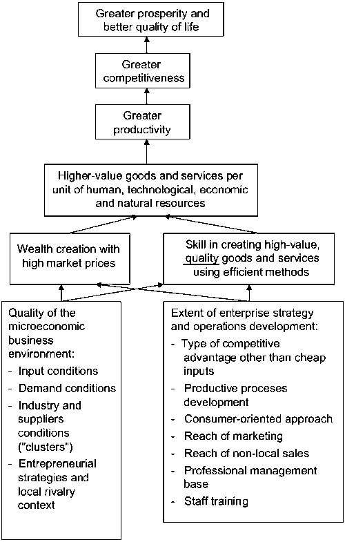 Porter (2003) holds that wealth and prosperity are created at the microeconomic level by economic actors, particularly the enterprises and other productive bodies. Moreover, the same author postulates that the determinants of enhanced productivity can be grouped under two major factors: the quality of the microeconomic trade environment, and the degree of development of enterprise operations and strategies. Lowincome countries, which usually have economies based on comparative advantages such as cheap labour and abundant local natural resources, need to improve their competitiveness determinants. They need to stop relying on their comparative advantages only and develop their competitive advantages in terms of their own unique products and processes (Porter, 2003). That is, the private sector actors should improve or change the way they compete to achieve economic development. For this they need better-qualified personnel, better information, better infrastructure, better suppliers and better relationships (Porter, 2003). Dirven (2001), for example, shows that small and medium enterprises are subject to and sidelined by factors such as economies of scale, access to international capital markets, perhaps limited local technical capacity, growing pressure from supermarkets, and the new developments in trade conditions. Figure 8 is an attempt to summarize Porters postulates (2003). The sub factors determining the business environment have been conceived by Porter as four interrelated areas, represented by what he calls the diamond of competitiveness, listed in the lower lefthand box of Figure 8.