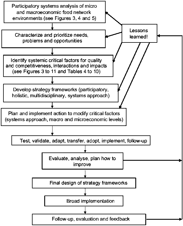 A systems analysis aimed at reaching an acceptable level of competitiveness needs to focus on boosting the key determinants of technical, scientific, commercial, economic and institutional capacity. The overall approach should be founded on an analysis of food quality systems within a systems analysis of competitiveness. This means using the systems analysis to identify the specific context, components, relationships, priorities and key factors which can efficiently and truly bring about a sustainable increase in food quality and competitiveness.
