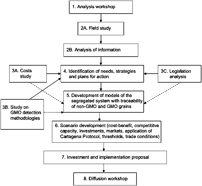 Based on the specific suggestions form the workshop participants a field assessment was done, in which the different grain chains from production to export were visited and appreciated, complemented with interviews, visits and searches in national institutions related to those chains, in order to gather primary and secondary information, and then propose feasible actions for improvement of those chains and/or adjustment in order to be able to meet regulatory and market requirements. In other words, the project would propose the best possible options for producing, handling, trading and exporting segregated non-GMO and GMO maize and soybeans. Practical aspects of the type of information to be gathered during the field study would be the identification of: