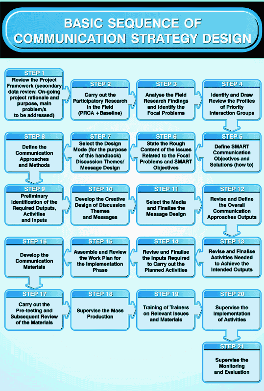 To summarise, the box below reflects the basic sequence of the main steps you will go through in the process of developing a communication strategy. As the message design is by far the most common mode to be used in communication campaigns, this sequence has been developed considering message design as the main approach. If other approaches/modes will be used, they will be added following a similar sequence.