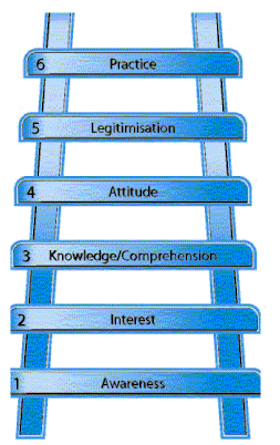 In most instances change can be considered to be an innovation. Hence it can be dealt with as an adoption of innovation. The Adoption Ladder process, highlighted in figure 5 on the right, can help you to understand better the sequence of such adoption and the various communication levels: