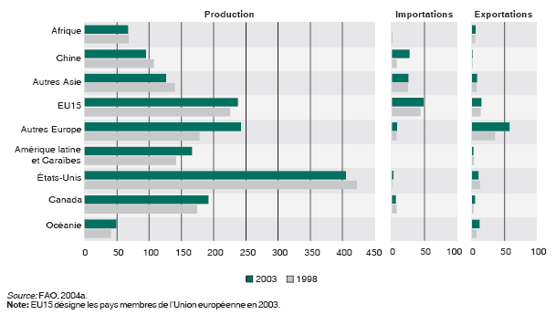 Le commerce des papiers, des cartons et des pâtes a connu une augmentation régulière, avec un accroissement mondial de la demande des produits en papier (Figure 5). En 2003, la production et le commerce ont atteint des niveaux records en Europe. Les expéditions des principaux pays exportateurs européens vers les marchés asiatiques représentaient 38 pour cent des exportations en 2003 et ont progressé de 48 pour cent depuis 2001. La consommation de papiers et de cartons en Europe centrale et orientale a été stimulée par la forte croissance économique de la région. Cette sous-région était importatrice nette de pâtes et de papiers (CEE-ONU/FAO, 2004). La Fédération de Russie a accru sa production, ses importations et ses exportations, bien que sa production n’ait pas encore retrouvé les niveaux de la fin des années 80. La Chine a accru sa production et ses importations de pâtes et de papiers. Les États-Unis, premier producteur et importateur de ces produits, ont réduit leur production et accru leurs importations au cours des cinq dernières années (FAO, 2004a).