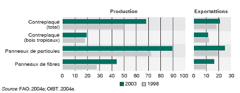 La production et le commerce des panneaux dérivés du bois (placages, contreplaqué, panneaux de particules, panneaux de fibres, panneaux structuraux orientés et autres panneaux reconstitués) ont augmenté ces dernières années (figure 3). La production et les échanges de panneaux de particules ont connu une expansion particulièrement rapide en Europe occidentale et en Amérique du Nord. Les exportations en provenance de la Pologne, de la République tchèque, de la Thaïlande et de la Malaisie se sont aussi accrues.