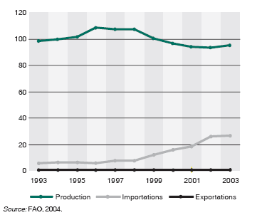 Les importations totales de tous les produits à base de bois et de fibres ligneuses de la Chine, calculées en équivalents de bois rond industriel, se sont élevées à plus de 100 millions de mètres cubes au cours des deux dernières années (figure 6). Bien que le pays doive encore équilibrer la valeur marchande de ses produits forestiers, il ne fait pas de doute qu’elle joue un rôle croissant dans le commerce mondial des produits forestiers et qu’elle est maintenant un important consommateur mondial de ces produits. Les coûts de la main-d’œuvre étant encore assez faibles, le mobilier et le contreplaqué sont très compétitifs, ce qui a d’importantes répercussions pour les pays qui exportent actuellement des produits vers la Chine ou d’autres pays vers lesquels la Chine exporte aussi.