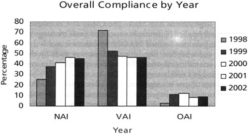 FDA considers NAI and VAI inspections to be in compliance with the regulations. As Figure 1 shows there is significant overall compliance, about 91% in 2002, and that this level has been only incrementally improving. We believe that the 2002 compliance rate represent success of Seafood HACCP implementation in the United States and the agency will be pressing for further improvements in the future.