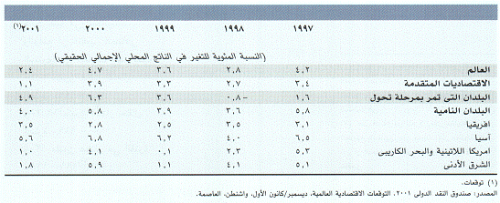 (11) ما لم يذكر غير ذلك، فان التقديرات والاسقاطات الخاصة بالاقتصاد الكلى الوإردة فى هذا القسم مستمدة من صندوق النقد الدولى 2001، التوقعات الاقتصادية العالمية، ديسمبر/ كانون الأول، وإشنطن إلعاصمة.