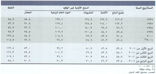 وتعرضت السلع الأولية غير الوقود لانخفاض شامل قدره بنحو 5 إلى 6 في المائة في 2001. وكان الانخفاض شديدا على وجه الخصوص في المشروبات الخفيفة التي انخفضت أسعارها في 2001 بسنبة 19 في المائة عن مستوى عام 2000 (أنظر الجدول رقم 4). وانخفضت أسعار المواد الخام الزراعية بنحو 7 في المائة بالمقارنة بعام 2000، وزاد متوسط أسعار المواد الغذائية زيادة طفيفة بلغت نحو 3 في المائة في 2001 إلا أنها ما زالت دون المستوى العالي الذي ظلت عليه لعدة سنوات.