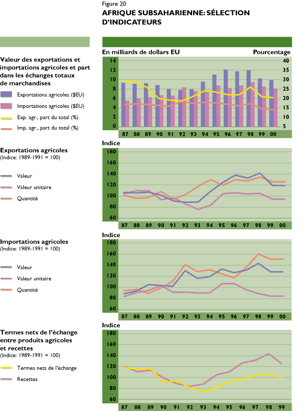 On enregistre un tassement très marqué des résultats de l'agriculture de l'Afrique subsaharienne en 2000. La production agricole totale a diminué de 0,3 pour cent en 2000, après avoir augmenté de 3,7 et de 1,9 pour cent en 1998 et 1999, respectivement. La production agricole a baissé de 1 pour cent, et la production vivrière s'est contractée de 0,3 pour cent. La production céréalière a chuté de 3,2 pour cent, pour la deuxième année consécutive. L'augmentation de la production de racines et tubercules n'a été que de 0,5 pour cent, alors qu'elle avait atteint 4,2 et 5,5 pour cent en 1999 et 1998, respectivement. La croissance de 1,4 pour cent de la production animale reflète un ralentissement par rapport aux deux années précédentes. Les estimations préliminaires pour 2001 laissent prévoir des résultats décevants pour l'agriculture de la région puisque les productions agricoles ne devraient pas dépasser 1 pour cent, avec une croissance de 0,9 pour cent de la production agricole et de 0,5 pour cent de la production animale.