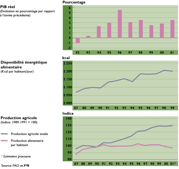Les estimations préliminaires pour 2001 portent à croire que la progression de la production agricole ne dépassera pas 0,5 pour cent. Toutefois, la saison des pluies a été favorable à la production céréalière des pays du Sahel et des récoltes records sont prévues au Burkina Faso, en Gambie et au Niger.