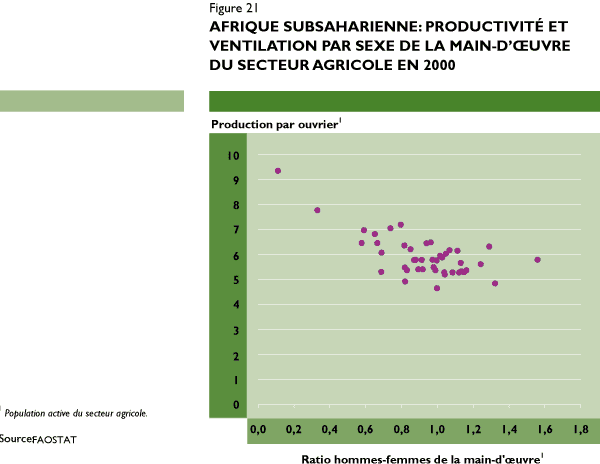 La productivité comparée des hommes et des femmes dans l'agriculture africaine subsaharienne a fait l'objet de nombreuses analyses. Les conclusions indiquent que la productivité inférieure chez les agricultrices est fréquemment causée par un accès insuffisant aux ressources. La faible productivité des femmes apparaît également dans la figure 21: la production moyenne par agriculteur tend12 à être plus basse dans les pays où la part des femmes dans la main-d'uvre agricole dépasse celle des hommes.