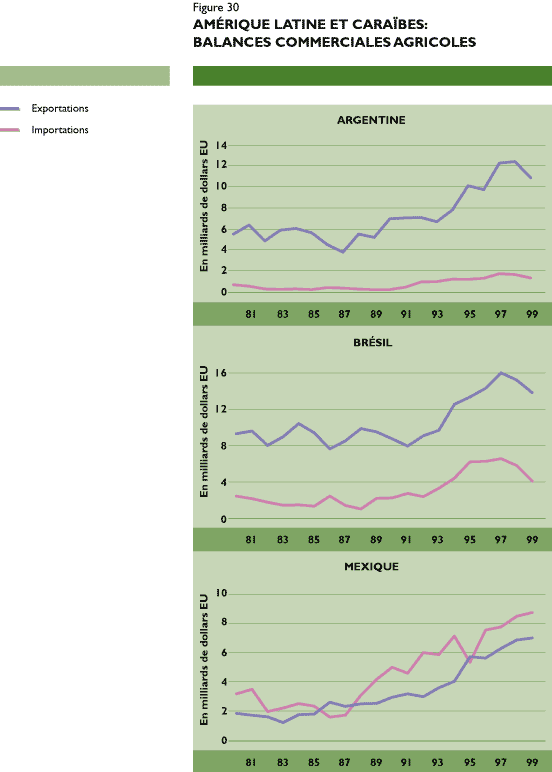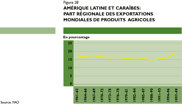 Comme nous l'avons vu plus haut, dans l'ensemble les deux dernières décennies ont été défavorables aux principaux exportateurs de produits tropicaux; le prix des céréales a augmenté (il ne faut pas oublier que, sauf les deux grandes exceptions que sont l'Argentine et l'Uruguay, la plupart des pays de la région Amérique latine et Caraïbes sont importateurs nets de céréales), et la baisse des prix des produits exportés n'a pas toujours pu être compensée par une hausse des volumes.