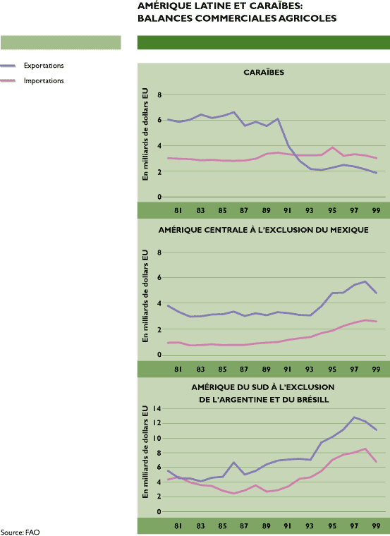 Bon nombre des pays de la région sont dans une situation apparemment paradoxale: ce sont à la fois des pays très agricoles et des pays très tributaires de l'importation de produits agricoles. Cela s'explique généralement par le fait que les produits exportés (essentiellement des produits primaires non alimentaires) ne sont pas les mêmes que les produits importés (principalement des céréales).