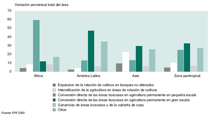 Los datos de la Evaluación de los recursos forestales mundiales 2000 (ERF 2000) revelan una pérdida considerable de bosques en las regiones tropicales en el decenio 1990-1999, pero también un aumento en muchas zonas templadas (véase la Figura). La mayoría de las pérdidas se han debido a la conversión en gran escala de los bosques en tierras agrícolas, incluida la ganadería, y en menor medida al cultivo migratorio. Se conoce menos sobre la expansión forestal, aunque hay algunas indicaciones de que tierras agrícolas marginales son recuperadas por los bosques incluso en zonas tropicales.