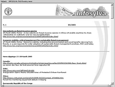 La FAO ha iniciado recientemente un nuevo servicio gratuito de información electrónica que ofrece periódicamente a los suscriptores noticias e informaciones forestales. Infosylva contendrá noticias de la FAO, así como enlaces a noticias seleccionadas del mundo forestal, tomadas de recortes de periódicos y revistas de todo el mundo y disponibles en español, francés o inglés. La finalidad de este boletín electrónico es mantener informados a los lectores sobre los acontecimientos forestales recogidos en los medios impresos de todo el mundo y propiciar los debates.