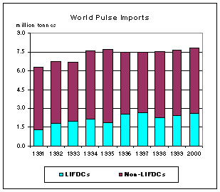 Pulses are of special importance for the low-income food-deficit countries (LIFDCs) where the major sources of proteins and energy are non-animal products. Pulse production in LIFDCs in 2001 is expected to increase, with the bulk of the rise accounted for by major producing countries like India and China. Other countries like Egypt, Nigeria and Burundi are also expected to post some production gains. In contrast, smaller crops are expected in countries like Pakistan and Syria due to drought. LIFDCs' 2001 pulse use is expected to outpace production, especially in such traditional consuming countries as India and Pakistan. With demand exceeding production, total pulse imports by LIFDCs are seen to rise in 2001.