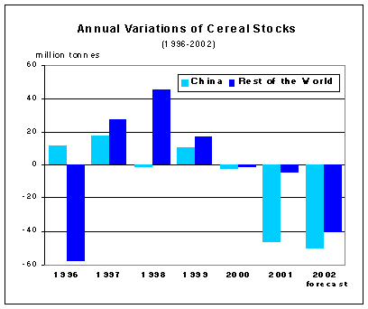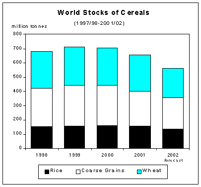 World cereal carryovers for crop years ending 2002 are forecast to fall to 562 million tonnes, 92 million tonnes, or 14 percent, below their already reduced opening levels, and 40 million tonnes less than was reported in June. Since the previous report, the forecast for cereal production in 2001 (including rice in milled terms) has been lowered by 36 million tonnes and this has given way to a further cut in the forecast for this season's ending stocks. Overall, this year's sharp decline in cereal stocks mostly stems from smaller crops in China as well as in a number of major cereal exporting countries. In China, cereal stocks are