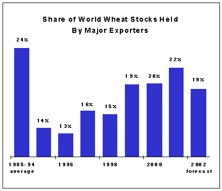 since 1998, although still well above the level of the mid-nineties. The decline in wheat inventories of the major exporters would also entail a drop in the ratio of their aggregate wheat stocks to their total disappearance (the sum of their domestic consumption and exports), which is currently envisaged to reach 17 percent, down considerably from 23 percent in 2000/01 and lowest in four years. In addition, the global share of total wheat stocks held by major exporters would also be smaller; around 19 percent as compared to 22 percent in the previous season.