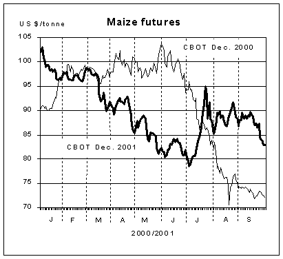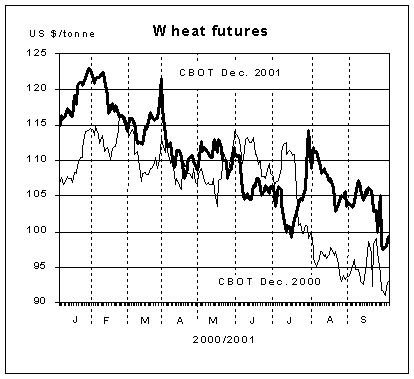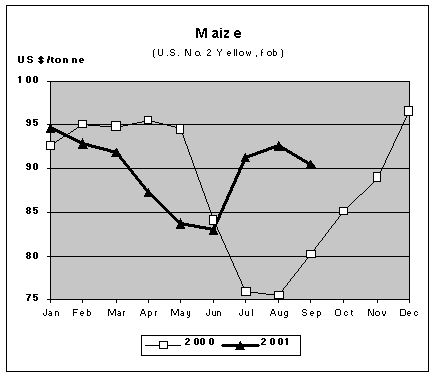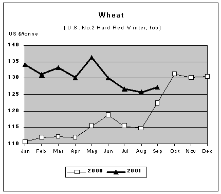 recovery after the start of the current marketing season in July, but the economic and the political uncertainty triggered by the tragic events of September 11th seems to have put a damper on any further price gains, at least in the short-term. In September, the US wheat No. 2 (HRW, fob) averaged US$127 per tonne, slightly up from the corresponding period last year. Wheat prices have remained above last year's levels so far this season, but as harvesting in wheat producing countries in the northern hemisphere receded and it became clear that large exports from a number of non-traditional exporting countries, such as India, could also make it to world markets, export prices weakened and the gap narrowed considerably.