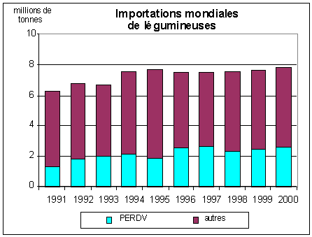 Les importations de légumineuses des PFRDV sont estimées à quelque 2,5 millions de tonnes, soit plus de 30 pour cent des importations mondiales. Entre 1990 et 1999, elles ont progressé de 6 pour cent par an, ce qui est dû au fait que la production intérieure augmentait moins vite que la demande. Les haricots secs étaient autrefois la principale légumineuse importée par ces pays, mais depuis peu ils ont été supplantés par les pois secs. L'accroissement des importations de pois secs est dû essentiellement au fait que l'Inde et le Bangladesh ont augmenté leurs achats. Les lentilles, les pois chiches et les fèves sont aussi importés en quantités notables par les PFRDV. Parmi ceux-ci, les principaux importateurs de légumineuses sont le Bangladesh, l'Inde et le Pakistan et le principal fournisseur est le Myanmar. L'Égypte importe beaucoup de fèves, principalement d'Australie. Du côté de l'exportation, un des grands faits nouveaux est l'apparition de la Chine qui est devenue un gros exportateur de haricots secs en particulier, surpassant le Myanmar qui était autrefois le premier exportateur. Cuba, l'Égypte et l'Indonésie sont devenues des débouchés importants pour la Chine.