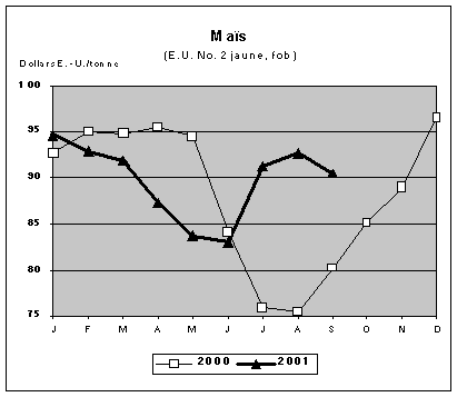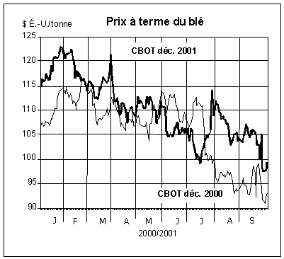 Comme les prix de la plupart des autres produits primaires, les prix des céréales ont généralement tendance à baisser. Les cours internationaux des céréales ont légèrement remonté après le début de la campagne de commercialisation en cours en juillet, mais les incertitudes économiques et politiques provoquées par les événements tragiques du 11 septembre semblent empêcher toute hausse future, du moins à court terme. En septembre, le blé États-Unis n° 2 (HRW, f.o.b.) se vendait en moyenne 127 dollars É.-U. la tonne, soit un peu plus qu'en septembre 2000. Jusqu'à présent, dans la campagne en cours, le prix du blé est resté plus élevé que l'année dernière, mais lorsque la récolte des pays de l'hémisphère Nord s'est achevée, et qu'il est devenu clair que plusieurs exportateurs non traditionnels comme l'Inde allaient exporter des volumes importants, les prix à l'exportation ont fléchi et la différence s'est considérablement réduite.
