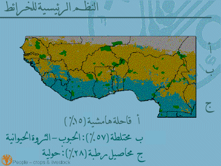 في حين يشكل المناخ العائق الرئيسي لزراعة المحاصيل في الشمال، فإن المحاصيل المعمرة ومناطق الغابات (مثلا ليبيريا وكوت ديفوار) تسود الجنوب الرطب. باء - يتميز الحزام الجنوبي والساحلي، خارج منطقة الغابات، بنظم تسودها محاصيل الحبوب والتي تتفاوت بين التكثيف الزراعي المتوسط والعالي (أزرق خفيف وداكن. وتوجد أعداد قليلة من الأبقار في هذه المناطق. وتغطي هذه النظم معظم الأجزاء الجنوبية من غانا، توغو، بينان، ونيجيريا). جيم - تتركز نظم الزراعة المختلطة (الأصفر) حيث توجد المحاصيل والأبقار جنبا إلى جنب، بصورة رئيسية، حول مناطق التكثيف الزراعي العالي (الأحمر) في حزام التكثيف المحصولي المتوسط إلى عالي: هضبة جوس ومنطقة الاستيطان القريبة في نيجيريا، جنوب النيجر، وسط بوركينا فاصو (أوغادوغو) ومنطقة داكار في السنغال. وتحيط بهذه المناطق رقع مميزة بنظم الزراعة المختلطة التي تسودها المحاصيل أو الأبقار: حيث توجد الأولى في جنوب النيجر (أخضر داكن: نظم الزراعة المختلطة ذات المساحة الواسعة - الإنتاجية المنخفضة) وتتأثر الأخيرة في نيجيريا وبوركينا فاصو (أخضر خفيف). دال - توجد النظم التي تسودها الأبقار مع مستويات محصولية منخفضة (بني) على أطراف نظم الزراعة المختلطة في الحزام الأوسط. وهي تعادل، في المناطق الأكثر جفافا، المناطق الرعوية التقليدية، على حين أن معدلات تكوين القطعان زادت كثيرا نحو الجنوب وفي المناطق الأكثر رطوبة، في أعقاب فترات الجفاف في السبعينات والثمانينات. وأصبحت معظم هذه المناطق الآن خالية من مرض العمى النهري مما زاد أكثر من حركة وفود المزارعين إليها. ومن المناطق "الريادة الحدودية" النموذجية (أ) جنوب مالي، جنوب بوركينا فاصو وشمال كوت ديفوار؛ (ب) شمال غرب غانا؛ (ج) وشمال وشرق بينان. هاء - توجد نظم التكثيف الحيواني العالي المميزة في هضبتي أداماوا ومامبيلا في الكاميرون ونيجيريا.