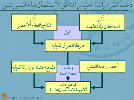 13 - وكانت المبررات لاختيار هذه المعايير أنه ما لم تكن الخريطة الزراعية في مرحلة تحول، وعلى الأخص فيما يتصل بالتغيير صوب التكامل المحصولي - الحيواني، فلا جدوى من الدعوة إلى مكافحة التسي تسي في كامل المنطقة. وترتبط أسباب ذلك بالتغييرات في استخدام الأراضي. إذ أن النمو السكاني يزيد من الضغوط على الأراضي الأمر الذي يؤدي، في المناطق المتضررة من التسي تسي، إلى تبدل البيئة البيولوجية المادية/ الريفية على نحو تصبح فيه الطبيعة أقل ملاءمة لاستمرارية ذبابة التسي تسي.
