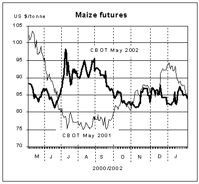 International maize price movements also tended to display a similar pattern as wheat, given their very comparable supply/demand conditions. The rise in world maize production and the exceptionally large export supplies from a number of non-traditional exporters, such as Brazil, continue to weigh on the market. In January, the US maize export price quotations for US No.2 Yellow averaged US$92 per tonne, up US$2 from November 2001 but still below the corresponding period last year. In light of the subdued world demand, the prospect for any moderate increase in prices over the next few months also remains limited. In recent weeks, the CBOT values have fallen below the levels of the previous season and, by late January, the May maize futures were quoted at US$84 per tonne, still lower than last year.